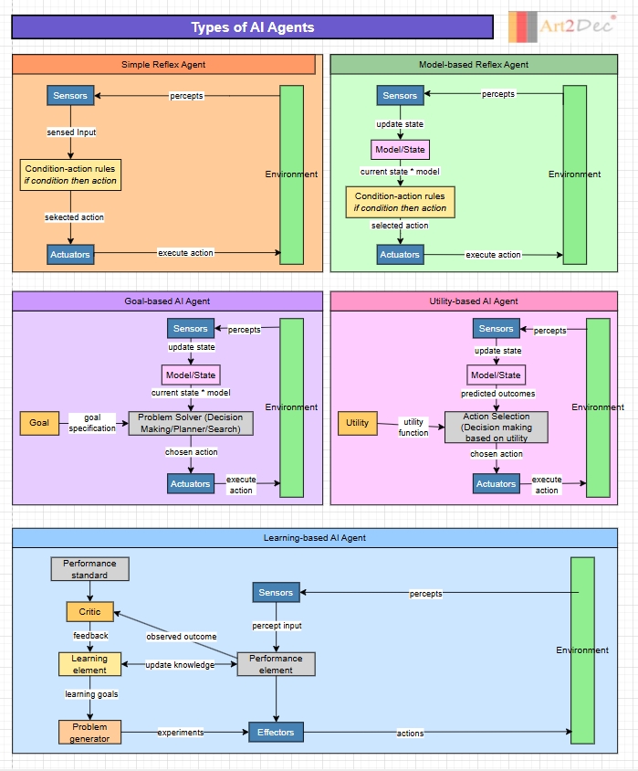 - Learning Agents: These are the most advanced. They improve continuously, using feedback to adapt and perform better over time.
