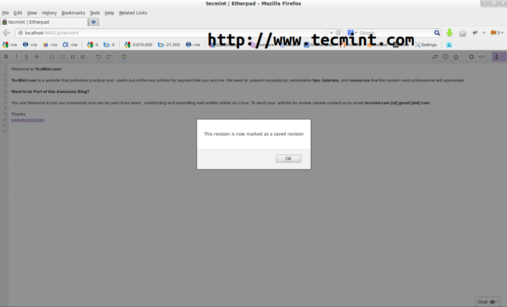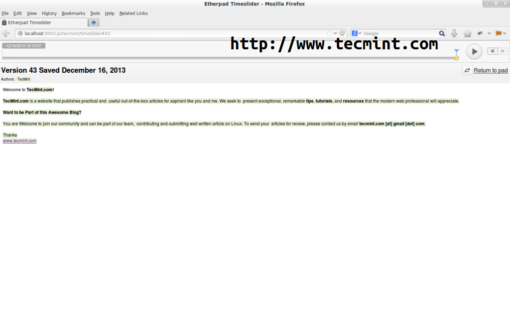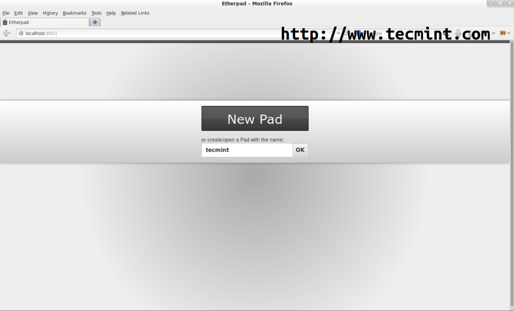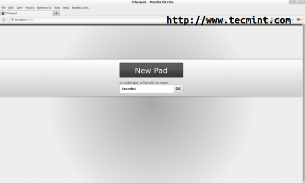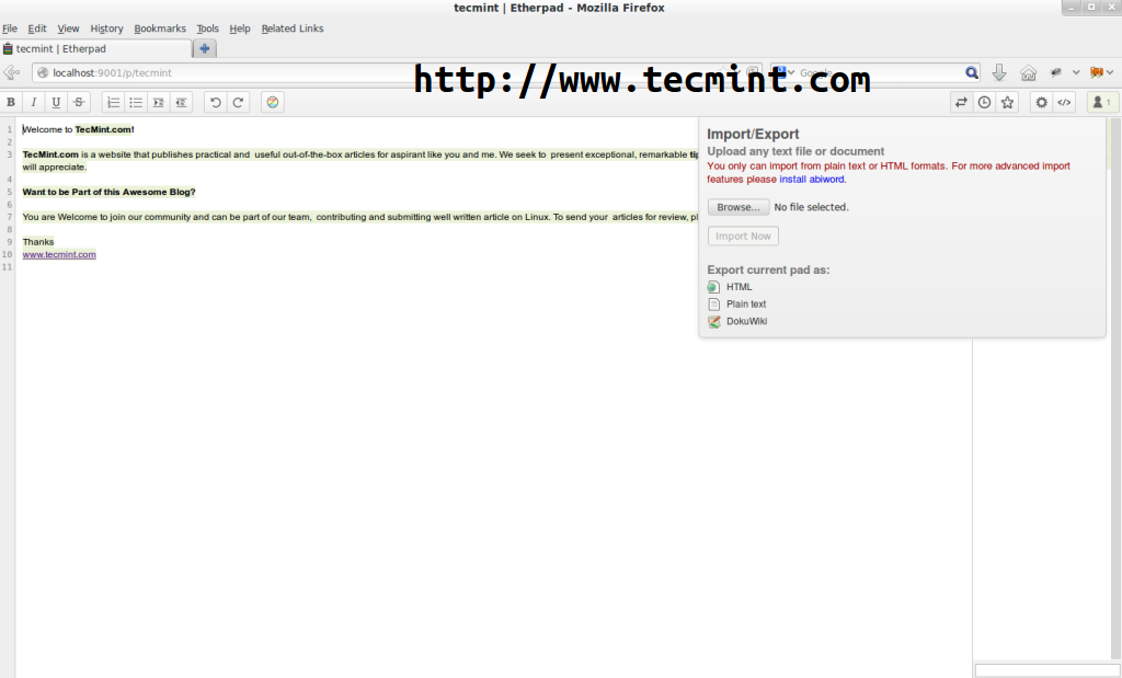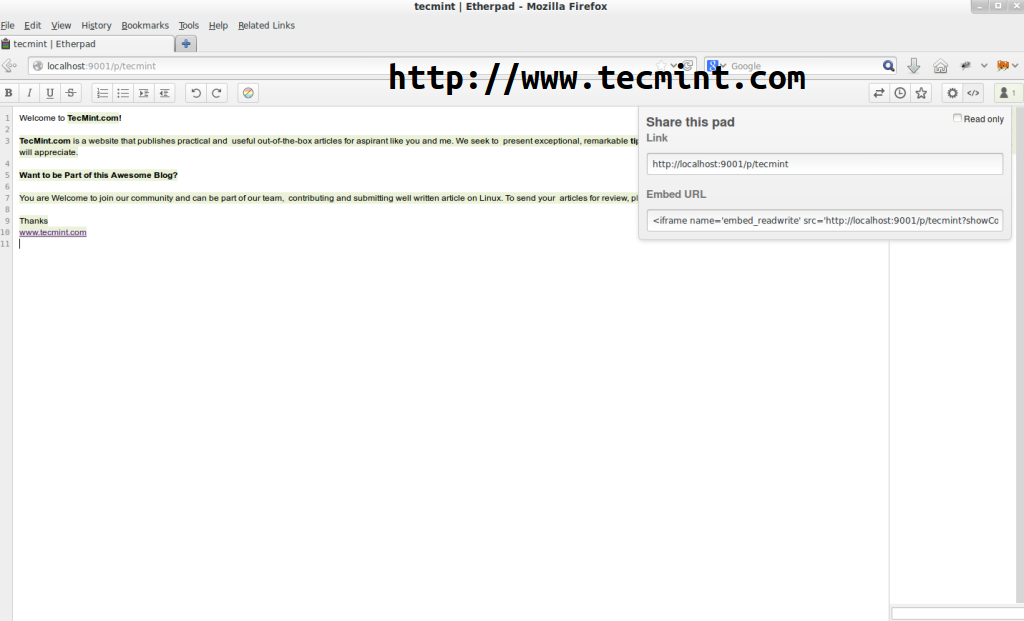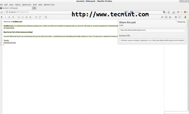 Each newly created document has its own URL structure. For example, my new “tecmint” pad get’s a URL as http://your-ip-address:9001/p/tecmint. You can share this document URL with your friends and colleagues. You can even embed the editor window into another HTML web page as an iframe.