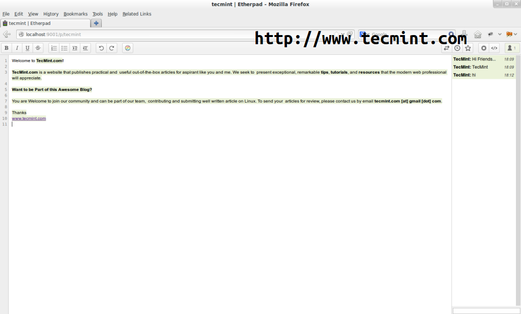 For example, I’ve created a new document called “tecmint”. User’s can create multiple new pads in separate windows, each user’s document window appears on another window automatically in real-time. Each user’s window is highlighted in two different colours and also user’s can interact with each other using built-in chat box.